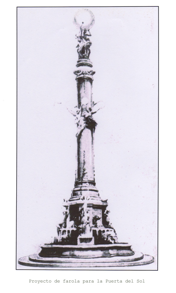 Quedaba una reminiscencia del pasado: una fuente Para reemplazarla se pensó en en una gran farola o foco eléctrico que iluminase la Puerta del Sol. Querol presentó el proyecto de farola o foco monumental en 1894, recién vuelto de la Academia de Bellas Artes de Roma para realizar el Frontón del Palacio de Biblioteca y Museos Nacionales. Las primeras noticias sobre esta gran farola o foco eléctrico fueron recogidas por Balsa de la Vegaen la revista La Ilustración Artística en el artículo titulado Crónica de Arte[11].Mientras la publicación y conocimiento gráfico del proyecto fue más tardío, concretamente en 1902, y, solamente fue dado a conocer con comentario e información gráfica por la revista Blanco y Negro. En este sentido, escribió lo siguiente en su sección de Actualidades: “Dentro de séis o siete meses será colocada en el centro de la Puerta del Sol la farola monumental, cuyo proyecto notabilísimo, debido al insigne escultor y querido colaborador nuestro D. Agustín Querol, publicamos. El boceto y el plan de esta hermosa obra han merecido justos y grandes elogios”[12].