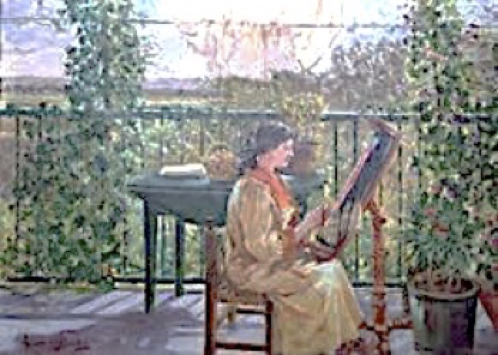 Rica gama de verdes con pincelada precisa en las plantas y difusa en el resto para conseguir profundidad espacial. Dibujo detallado del mobiliario sobre todo el pie torneado del bastidor. Transparencias producidas por la luz en la cortina batiente al viento, que recuerdan a los luministas valencianos en su juego de luces y sombras. Las plantas son semejantes a las que aparecen en su representación del patio de Quinto, por lo que podríamos pensar que está pintada en ese lugar y también por las montanas lejanas que podrían ser estribaciones del Sistema Ibérico.