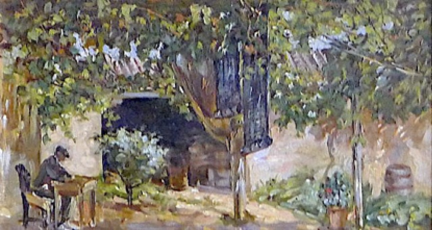 Es un paisaje plenairista tomado desde un punto de vista bajo durante un día veraniego en el que la luz incide con brillantez en el colorido de los arbustos y plantas y que, al pasar a través de las ramas y hojas del árbol, descompone la luz que se proyecta en la pared con tonos violáceos y blancos. Dan profundidad a la obra los soportes curvados de ascenso y en disminución para las parras que exceden el marco de la obra, lo mismo que el árbol, del que sólo se puede ver el inicio de la copa.