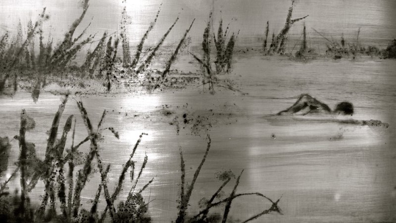 “..De esa transición comienza a investigar con materiales como el cinc como soporte pictório dando importancia al material en su interacción con la luz reflejada que se convierte en elemento imprescindible para comprender su obra..”