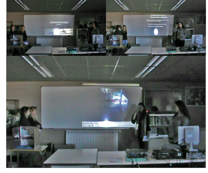 Como se aprecia en la imagen 3 durante la exposición de su propuesta, las estudiantes presentan al autor, analizan sus cambios estéticos y se centran posteriormente en la serie a la que pertenece la obra que han tomado cómo referencia para la elaboración de su “producto”. Se ha de destacar el discurso que elaboran las estudiantes en torno al autor y su obra y que se transcribe a continuación: