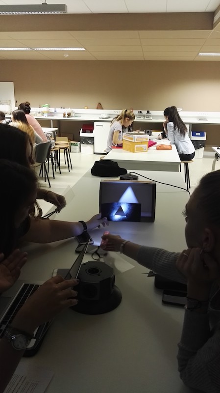 Preguntas que trascienden incluso los propios objetivos de aprendizaje, pero que, desde las áreas más vinculadas con lo manipulativo o lo tecnológico (T y E de tecnología e ingeniería en los procesos STEAM) y a su vez de la mano de lo crítico y creativo van a configurar su obra final: ver figura 4, donde se muestra un producto realizado por los estudiantes en el que se incorporan ellos a la propia obra y que como han señalado les permite introducirse en una nueva realidad de imágenes cruzadas, espejos, realidades casi paralelas que en función del uso de la luz les ayudará en el aula de primaria a explorar algunos fenómenos con los niños y a plantear experiencias críticas en un diálogo multidireccional entre la obra, la dimensión artística y científica. En palabras de las alumnas el producto y la propia experiencia han introducido en su aprendizaje los siguientes elementos: