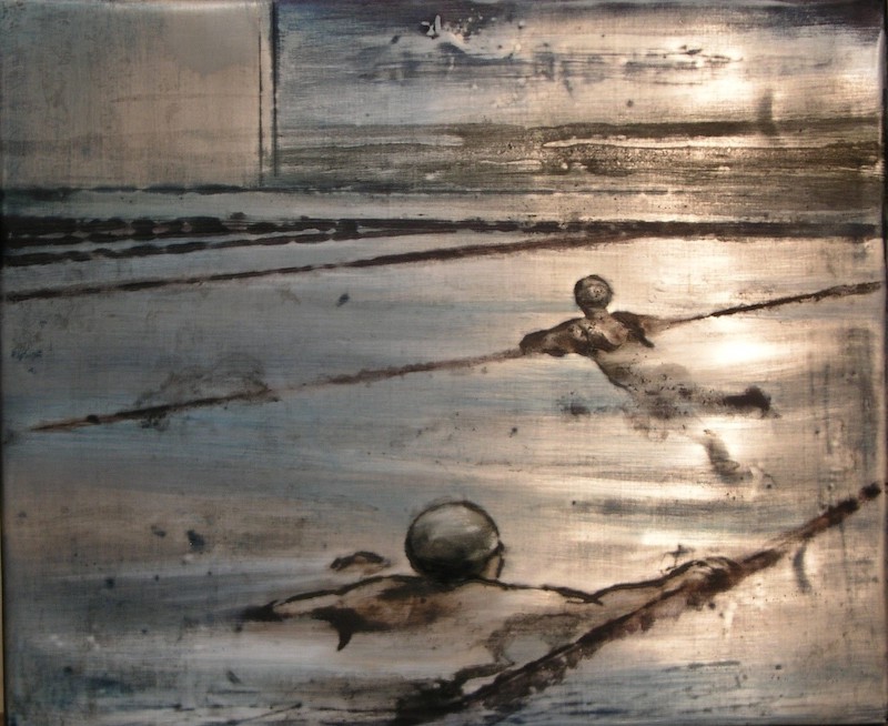 “..Los nadadores observan el paisaje, un sol de atardecer que se funde con las nubes y al fondo queda una línea del horizonte apenas perceptible donde el agua traspasa la barrera de la piscina y fluye mucho mas allá…”