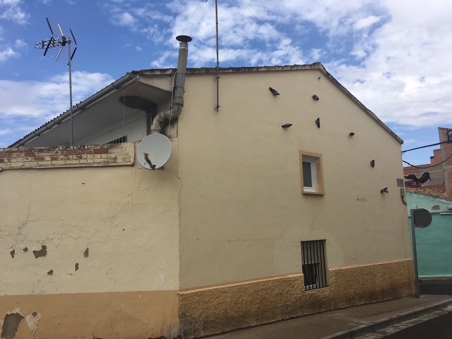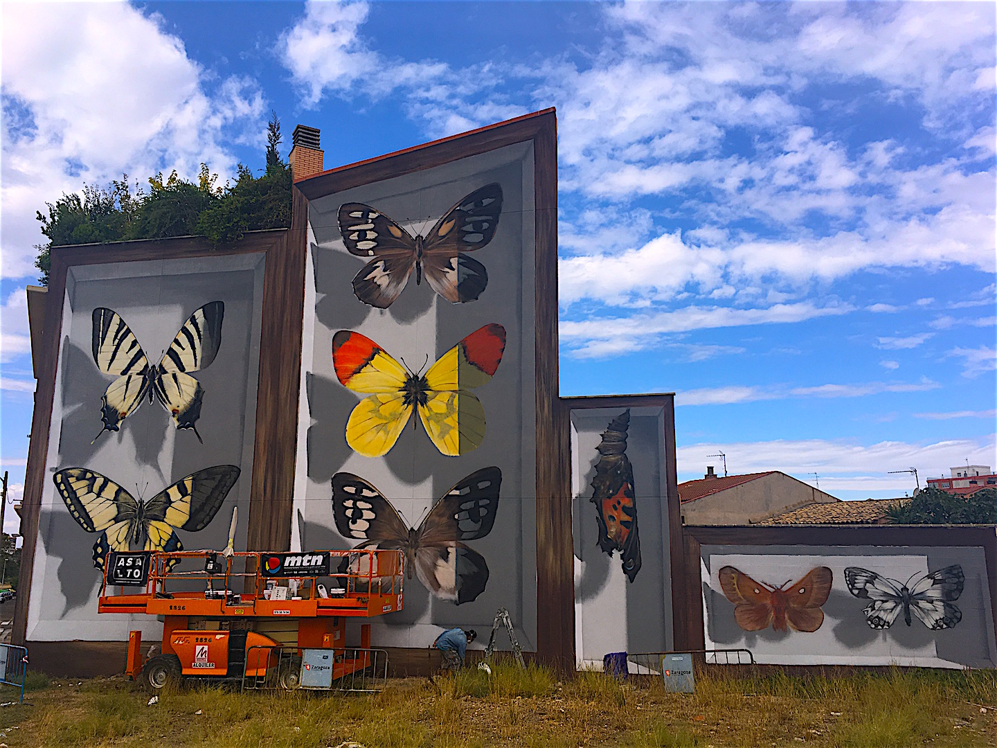 Jofre Oliveras también se ha inspirado en los muros del barrio y en los nombres de algunas de sus calles, astronómica revelación de quien dotara de nombre a las calles en sus inicios durante los años sesenta y setenta. Diversas constelaciones, por su importancia o significado han servido de modelo para sus bandadas de palomas, excesivamente realistas para alguno de los vecinos. Encontrarlas por el barrio es también encontrar a su autor pues ha pretendido representar esta especie urbana tan denostada en las constelaciones que mejor puedan captar su esencia: la importancia de determinadas estrellas para la navegación, la orientación, o su significación en la mitología antigua. Los jardines de la Estrella Polar, por cierto la más luminosa de la Osa Menor, una de las calles en las que ha intervenido Jofre, también han servido de galería, de Galería Urbana en concreto. Gracias a este proyecto determinados espacios urbanos se encuentran disponibles para que quien lo desee pueda ver su obra expuesta sobre muro. El procedimiento es sencillo, consiste en inscribirse en su página web y superar ciertos filtros. Para dar más visibilidad al propósito, este año se ha integrado en el festival, y han sido cuatro artistas, en femenino, quienes han plasmado sus inquietudes en estos muros. Lorena Cosba y Susana Blasco, fotógrafas, y Rebeca Zarza y Coco Escribano, ilustradoras. Las primeras han creado particulares composiciones a partir de fotografías de “personalidades” reales del barrio y de imágenes antiguas mostrando un tipo de evolución-conexión entre la gente y su tiempo. Las segundas han reflejado su lenguaje propio de la ilustración con personajes oníricos, dulces, ambiguos… Otra artista que ha participado decorando jardines del barrio ha sido Marta Boza, diseñadora e ilustradora que junto a Acción Contra el Hambre ha participado en un taller fabricando piezas con maderas superpuestas y coloreadas que combinan la forma con el mensaje. Mensajes imaginativos, palabras inventadas que llaman la atención sobre el hambre en el mundo.Volviendo a la fauna urbana en peligro de extinción llegamos a los muros de Mantra, conspicuo artista francés muy vinculado con Latinoamérica. La jungla y su fauna le han servido de inspiración para unas espectaculares mariposas que parecen querer salir de un marco que ya no las retiene. Siempre que vuelve a la ciudad echa en falta lo que le ata a la naturaleza. Son seres, imágenes, que para él representan la belleza, como ha hecho también otras veces representando rostros femeninos. Intenta relacionarse con el entorno, conocer el espacio, no en vano estas mariposas son especies autóctonas zaragozanas y aragonesas, algunas de ellas en peligro de extinción, así que, sirven también de llamada de atención. Su actitud y dedicación al trabajo ha conseguido captar a los vecinos y por eso podemos contemplar su obra por partida doble. En dos fachadas orientadas al este, en la calle Urano con Osa Menor y en la calle Tulipán llegando a la Vía Láctea. Orientación clave, pues la luz solar parece jugar con las sombras dibujadas dando vida a las mariposas. Es una obra que se puede ver por lo tanto a diferentes horas del día.