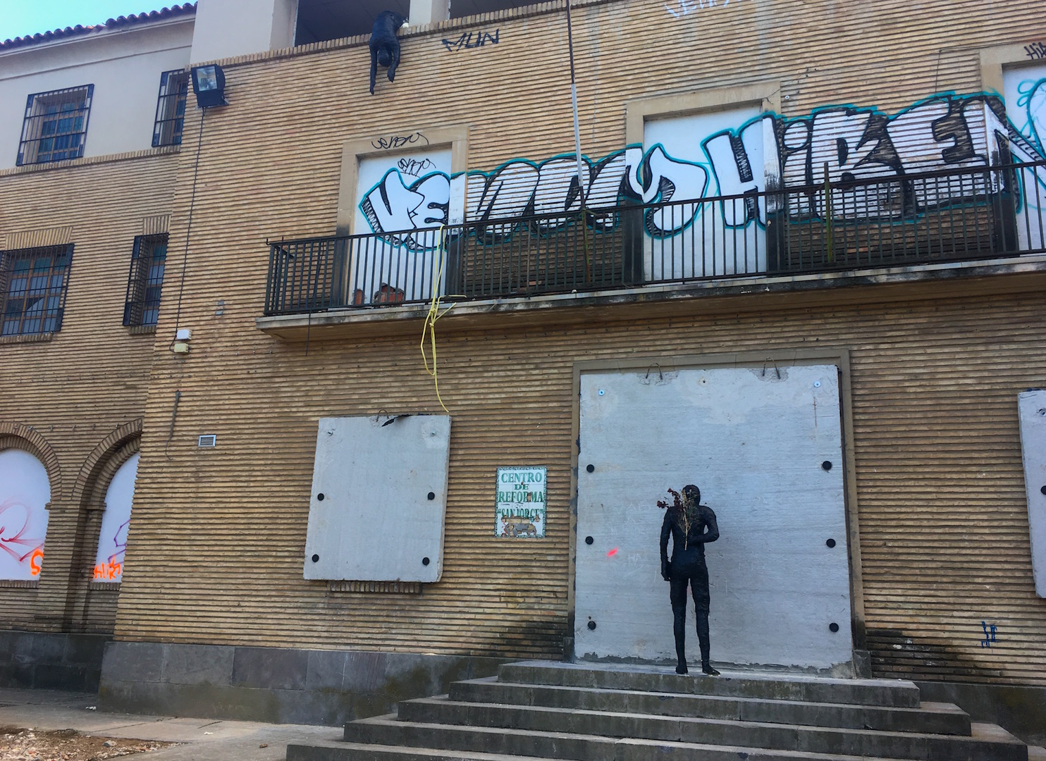 A partir de ahí, las intervenciones nos incitan a recorrer el barrio y conocer mejor su historia y su gente, presente en la mayoría de las intervenciones. Nos encontraremos durante el recorrido con Cere, que desde el graffiti, el diseño grafico y la publicidad ha decidido utilizar el espacio urbano para mostrar su personal propuesta. Diseños inspirados en los llamativos letreros publicitarios estadounidenses que combinan la tipografía con la estética de la publicidad de los grandes letreros de neón en fachadas y azoteas. Sus anuncios, breves frases, nos hablan de la actitud de la calle y de cómo el arte urbano comenzó como vía de escape a la frustración de quienes no encontraron mejor manera de hacerse ver en un entorno que los devoraba. Actitud real para Cere, hoy es considerado arte, pero durante mucho tiempo era vandalismo. Octavi Serra opta por una propuesta más particular, perfeccionamiento personal de su formación en Bellas Artes. Crea figuras en afligida posición gracias a moldes de si mismo que nos llevan a reflexionar sobre las condiciones más míseras del ser humano. Crítico activista, obtuvo gran repercusión gracias a una serie de manos amenazantes, pesimistas, desesperadas… que alertaban a los barceloneses allá por 2012 de los problemas sociales derivados de la crisis. Ahora son figuras completas, descolgado inerte por un balcón, trepando por una columna, sosteniendo la cabeza sobre si cuerpo o esperando inmóvil con unas flores marchitas a su espalda frente a un muro de hormigón. Su fragilidad y quizá la incomprensión han hecho que sufrieran más que ninguna otra intervención la condición efímera. Pero aún podemos ver dos de ellas en el nuevo jardín de Valdefierro, junto a los muros del Buen Pastor. Octavi forma parte de un colectivo, Cúmul, que a su vez ha participado renovando los muros de hormigón del parque de Valdefierro. Como si de un gran museo al aire libre se tratase, sus enormes y fríos bloques dan una visibilidad que las salas no consiguen y sirven de lienzo para revitalizar el escenario. El cúmulo, la repetición, es parte de su filosofía, pero basada en una contradicción, más es menos. Vacían de contenido un objeto, muchos objetos, para jugar con formas geométricas y diferentes perspectivas que dan libertad interpretativa a quien las observa, y que no han defraudado a nadie por su sencilla y sugerente plasticidad.
