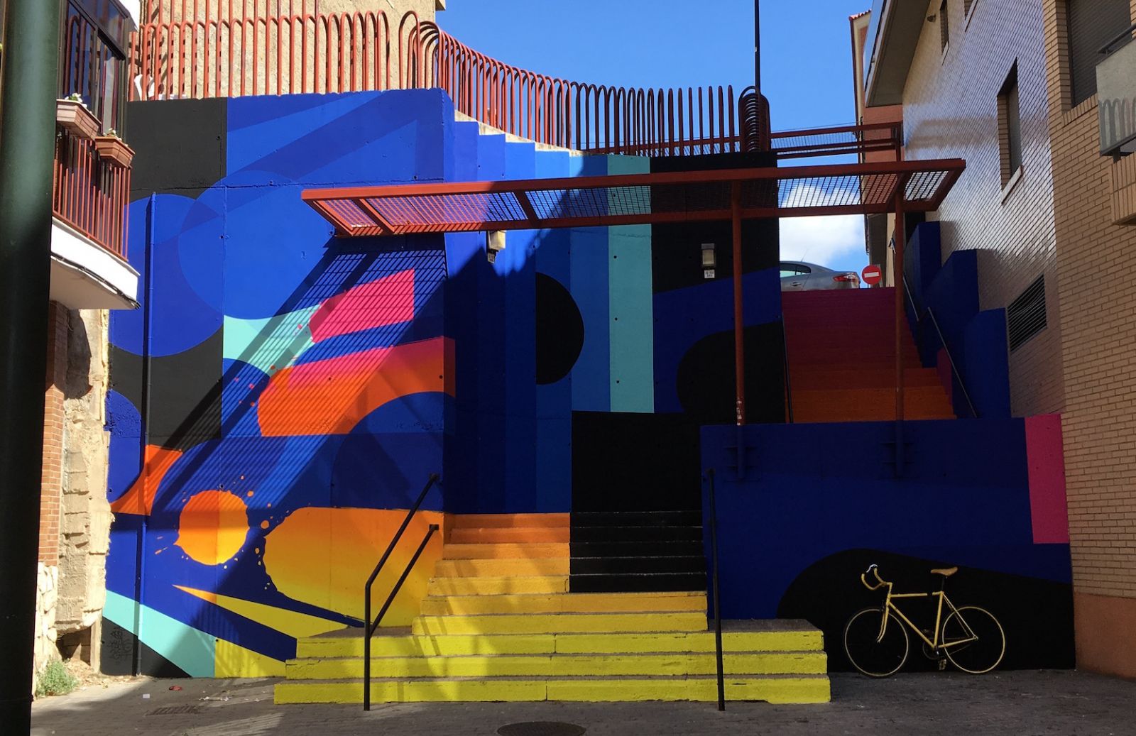 El concepto de abstracción más reconocible, el que identificó a Mondrian o Kandinski lo refleja fiel y espectacularmente Zest, francés de una ciudad, Montpellier, donde parece renacer la pasión urbana por el arte más abstracto. De nuevo en una calle de inspiración celeste, Proción, una construcción de hormigón salva un desnivel al que nadie prestaba mayor atención que la necesaria para alcanzar la cota deseada. La explosión de color, la potencia de las formas y la sintonía en la composición ahora invitan absolutamente a la admiración. Son muchas las perspectivas y los puntos desde los que disfrutar de su contemplación mientras uno se acerca para, por qué no, introducirse en una obra de arte. Y de paso, subir para encontramos con la obra de Helen Bur, británica pero que ha sabido plasmar perfectamente la esencia del barrio en su trabajo. En una de las medianeras que limitan el barrio hacia el este, pero mirando al sur en la calle Azalea, nos representa la historia del lugar y su preocupación por esos millones de personas que todavía hoy no pueden acceder ni al agua potable. Representa una mujer mayor que sujeta un caldero, esos con los que llevaban el agua a las casas del barrio desde las acequias en esos años en los que muchos inmigrantes de Extremadura y Andalucía llegaron cerca de Zaragoza con la perspectiva de un trabajo. Era una zona limitada por el canal imperial de Aragón, la nacional II y las vías del tren, de difícil orografía y carente de servicios. Construyeron sus casas con prisa para que la legalidad de entonces no las mandara demoler, trabajaban en la siderurgia y poco a poco serían ellos mismos los que dotaran al barrio de infraestructuras, incluida esa agua corriente. Del caldero cuelgan otros brazos, sin más cuerpo, que representan a esos desfavorecidos, de ahí el título del mural, Water/Life. Y junto a él jóvenes de rostro apocado como símbolo de los trabajadores anónimos. Superposición de imágenes y narrativa social, retratos que nos llevan a la reflexión más allá de la contemplación.