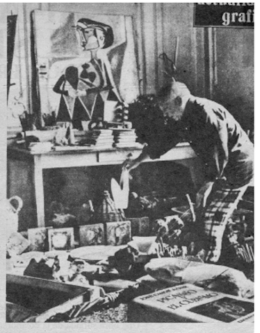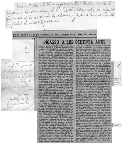 Recorte del ABC del 27/10/1961: artículo de Camón sobre Picasso con anotaciones añadidas del propio autor Foto de Picasso en su estudio, donde se ve en primer término el libro de Camón sobre Picasso y el cubismo. Distribuida por InterAmericanPressAgency en 1966 y muchas veces publicada por Camón