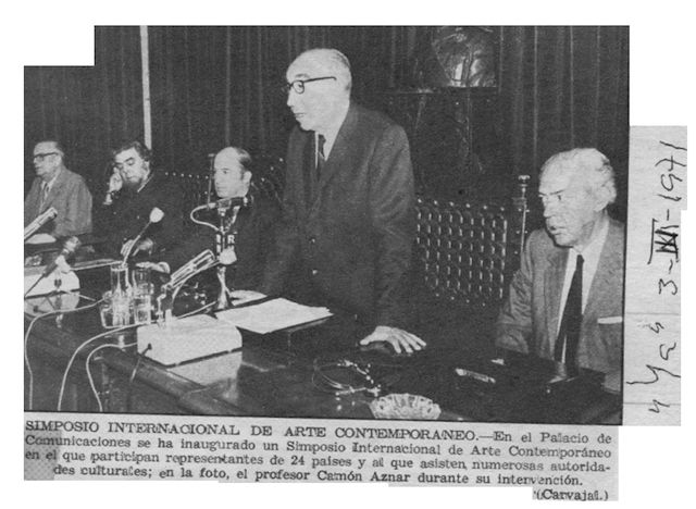 Incluso llegó a gozar también de un cierto predicamento internacional para estos debates, pues el 2 de marzo de 1971 inauguró el Simposio Internacional del Arte Actual (fig. 5), organizado por las Direcciones Generales de Relaciones Culturales y de Bellas Artes en el Palacio de Telecomunicaciones de Madrid, al que asistieron más de cuarenta críticos de 25 países, siendo clausurado con una ponencia de René Berger, presidente de AICA, en un acto celebrado en Cuenca, tras visitar los congresistas el Museo de Arte Abstracto de las Casas Colgantes. Y en junio de ese año Camón encabezó una delegación de quince críticos españoles invitados por la Fundación Gulbenkian a encontrarse en Lisboa con los críticos, directores de museos y responsables de la política cultural portuguesa: los discursos y actos oficiales tuvieron una generosa cobertura de prensa en el país vecino (Fig. 6).