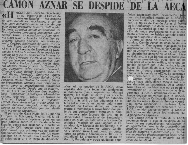 El propio Camón había tenido un pasado republicano, que el régimen franquista le hizo purgar, pero no tuvo reparo en brindar su amistad a Juan Antonio Gaya Nuño y darle gran visibilidad en la AECA, a pesar de que era un hombre vetado por el establishment oficial (como bien puso de relieve el propio Camón en la emotiva necrológica que le dedicó en ABC el 8 de julio de 1976). De hecho, su constante apoyo personal y profesional a Gaya Nuño constituye sin duda uno de los rasgos más entrañables del presidente-fundador de AECA, que le hace parecer más simpático en nuestros tiempos.