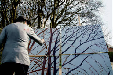 Recorren las carreteras comarcales con una furgoneta, despacio, cuando algo le llama la atención, dice a su ayudante y compañero desde hace 16 años, que pare, y ahí monta su caballete, coloca el lienzo, su mesa de trabajo, sus paletas, pinturas, pinceles… bien abrigado pues hace mucho frío y humedad.  Cuenta que ese frío le obliga a trabajar deprisa, no quiere decir hacer las cosas de cualquier manera, eso no, pero a veces mis mejores obras las he pintado muy rápido, si vas rápido quiere decir que te estás dejando guiar por tu intuición y hay que confiar en ella, no es bueno retocar una y otra vez. En el vídeo le vemos pintando un paisaje y lo termina en dos horas, se siente muy satisfecho con el resultado.