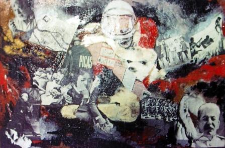 | Abrazo a nuestro mundo, 1965, collage (en portada: Santos de la era industrial, c. 1967, collage y resinas vegetales sobre tabla) |