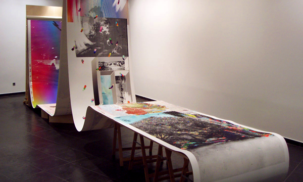 No es la primera vez que vemos un trabajo de este tipo en la obra de Radigales; en 2009 se puede apreciar un primer paisaje titulado “Contener la pintura” donde en una hoja de formato Din A4, con el mismo tipo de papel, realiza un collage intervenido tanto digital como manualmente con una serie de pinceladas acrílicas, y al igual que esta encontramos manchas situadas como coordenadas de distintos colores. También en 2011, con un acercamiento similar, realiza una obra titulada “Arcade”, con alusión nostálgica a los juegos Arcade de principios de los años ochenta, que es parecida a la actual en cuanto a las imágenes relacionadas con el territorio o la arquitectura, y que recompone el paisaje mediante el mismo tratamiento nuevo de formas. Es así como vemos en “12 metros de landscape” la culminación de una indagación a través de las distintas técnicas aplicadas a sus anteriores obras; sin embargo en esta ocasión y visto con la perspectiva que nos proporcionan sus obras anteriores, encontramos que la intervención se extiende tanto en papel como en profundidad, con la búsqueda del color.