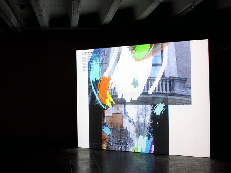 Como en el soporte físico sobre papel, los paisajes y retratos se suceden sin patrones específicos, pautadas por la aparición aleatoria de pinceladas acrílicas o píxeles perdidos que introducen inquietantes vacios en blanco.