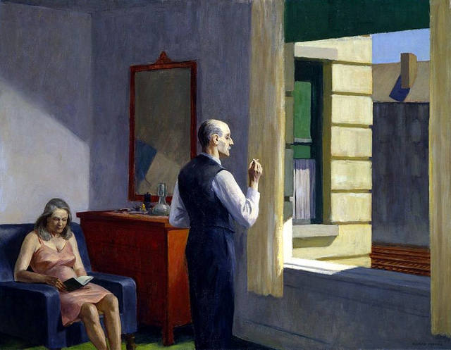 Muchas veces se ha dicho que Hopper es el pintor de la soledad, en sus escenas hay personas solas, pero también hay grupos de personas, parejas, personas que mantienen una conversación, personas que, estén juntas o no, próximas o no, no se comunican. La composición de Morning Sun (1952), así lo muestra, también son decisivas Summer in the City y en Conference at Night (1949). La obra de Hopper, es una verdad no exenta de ternura,  en donde lo contado sea más de lo que se deja por contar que aquello que se está contado. Nos ofrece un espectáculo interesante, pero, estamos fuera de él, ante él pero fuera de él. Disfrutamos con lo pintoresco de la escena, con  la satisfecha curiosidad por todos y cada uno de los detalles representados, pero lo hacemos en la distancia de un asunto que nos concierne de forma lejana. Night on the El Train (1918), la muy célebre House by the Railroad (1925). Incluso cuando se retrata,el pintor en su célebre autorretrato (1925-1930), establece una relación con nosotros, se coloca en un lugar dentro de la obra, como alguien más con el que podemos cruzarnos. A primera vista, la pintura de Hopper, parece de una extraordinaria sencillez, de una ingenua inmediatez, pero a poco que miramos nos damos cuenta de lo elaborado de su composición. Son tantos los recursos utilizados en sus obras, que no nos damos cuenta que somos nosotros los que vamos de un lugar a otro, comportándonos  como voyeurs extasiados