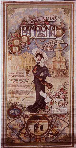 El tercero de los conocidos hasta ahora lo trazó Lafuente para las fiestas de San Fermín de 1906 (debió prepararlo para las de 1905 a juzgar por uno de los bocetos que conserva la colección familiar) y el esquema sigue siendo el mismo que en los dos anteriores: un tema central, figura o grupo, rodeado de algunos puntos fácilmente reconocibles de la capital en fiestas que no eluden el concepto escenográfico en los rincones urbanos y la influencia modernista tanto en algunas de las letras como en la orla que envuelve la composición.