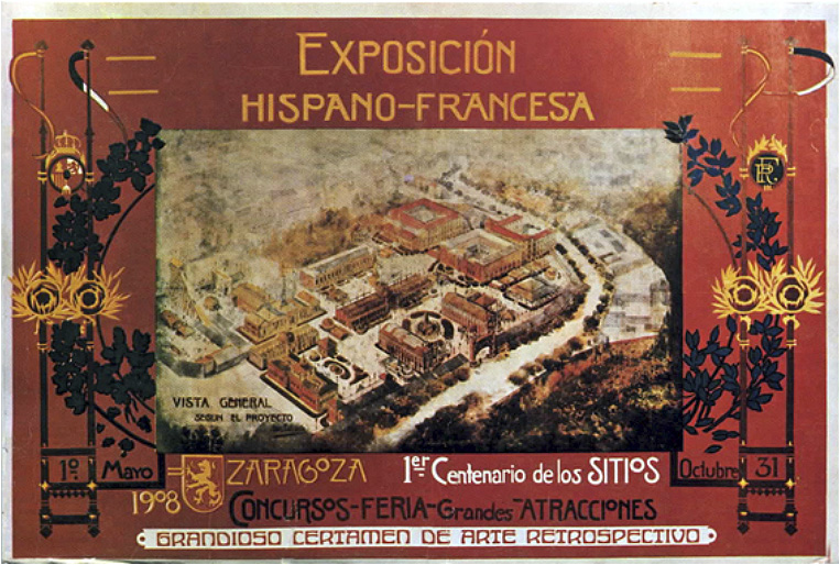 El cuarto fue el cartel oficial de la Exposición Hispano Francesa de 1908, que le fue encargado tras un largo proceso, pero que no deja de evidenciar el prestigio del que en ese momento gozaba en Zaragoza. Es una composición horizontal que parte de una visión axonométrica del conjunto de la Exposición elaborada desde los planos del arquitecto y amigo Ricardo Magdalena. Realizada en principio a plumilla para ilustrar la primera página del Heraldo de Aragón de 3 de noviembre de 1907 y reproducida coloreada al óleo sobre una tela, se rodea de una orla en que se añade información del acontecimiento y el calendario con marcado acento modernista en los textos. El original, de 128 x 192 cm., propiedad de la Cámara de Comercio zaragozana, pudo verse en la exposición Ideal de Aragón, regeneración e identidad en las Artes Plásticas, 1898-1939 que se presentó en el edifico Paraninfo de la Universidad de Zaragoza en 2015.