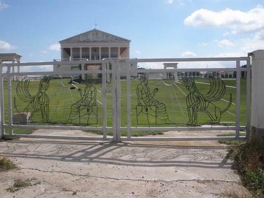 Este “templo griego” se alza sobre un terreno de 10 hectáreas, que era de su suegro, situado a las afues de la población y rodeado por una valla perimetral a fin de separarlo del “mundo profano”. Al igual que en la antigua Grecia los requisitos básicos a la hora de elegir el lugar para la edificación de un templo eran la presencia de un río o manantial[1], una adecuada orientacióncon respecto al sol, siendo la fachada principal la oriental y una hermosa vista panorámica capaz de provocar una emoción reverente.