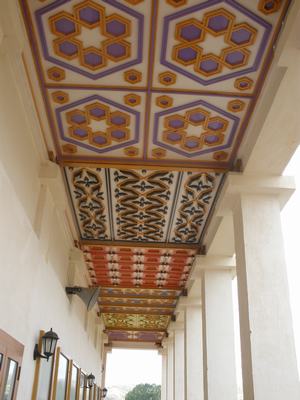 En los espacios entre las columnas hay pequeñas vidrieras estrelladas de diferentes tipos. La decoración se complementa con artesonado en el techo a base de cuadrados de diferentes tamaños en tonos rojo y negro.
