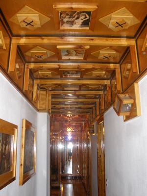 Otra de sus aficiones es la música, música que te acompaña de manera constante e incansable a lo largo de la visita. En el interior hilo musical, en el exterior altavoces. Notas que flotan de manera continua en el ambiente, creando, incluso, una sensación de agobio. Todo está abarrotado de decoración; artesonados, espejos, fotografías y… música.