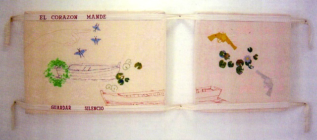 Para la exposición El novio de la muerte hay obras que Pepo Ruíz realizó utilizando el bordado con una técnica mixta.