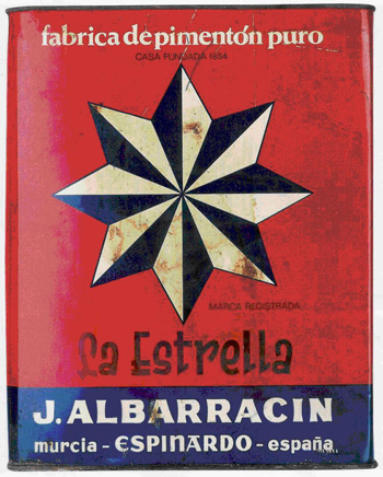 La Estrella. Envase metálico para pimentón. H 1965. J. Albarracín. Espinardo. Murcia (casa fundada en 1854). 32,5 x 25 x 18,4 cm. (Esta estrella no es otra cosa que un grano de anís estrellado).