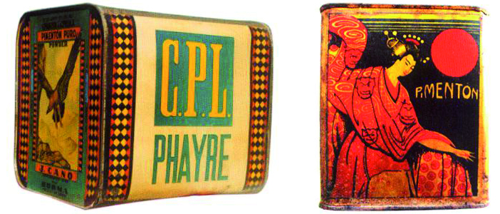Envases de 25 Kg. y 1 arroba respectivamente. En ellas podemos observar la clara alusión al color rojo, el color del pimentón. En la de la izquierda con la bandera nacional, y la de la derecha con la mujer oriental de traje rojo con un "sol naciente" rojo. Lata de 1 Kg. En ella podemos apreciar como la intención del autor del diseño, era que la imagen simulase estar hecha en manises o azulejos. Aquí si que está muy remarcada la idea modernista de la orla con motivos vegetales, aunque muy geometrizados.