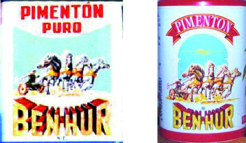 Hubo intentos de evolucionar el envase, conservando el mismo diseño gráfico, a pesar de que fueron solamente esporádicos e innovadores que no se han generalizado. Es este un punto importante pues he aquí un intento de romper con el peso de la tradición, con la monotonía de la lata cuadrada de latón y luego de aluminio, un intento de mejora que nos sirve para hacer un ahondamiento más profundo en el packaging de las empresas pimentoneras murcianas. Pues aunque estemos haciendo referencia a él constantemente al estudiar el envase del pimentón, es ahora cuando se produce un salto, un cambio brusco, pues se pasa de la lata cuadrada o rectangular de aluminio litografiada, al envase de plástico cilíndrico. Podemos observar como el nuevo envase conserva los colores, tipografías e imágenes que el antiguo. La marca que ponemos a continuación a modo de ejemplo gráfico de evolución es la de Ben-Hur, también de Espinardo (Murcia).