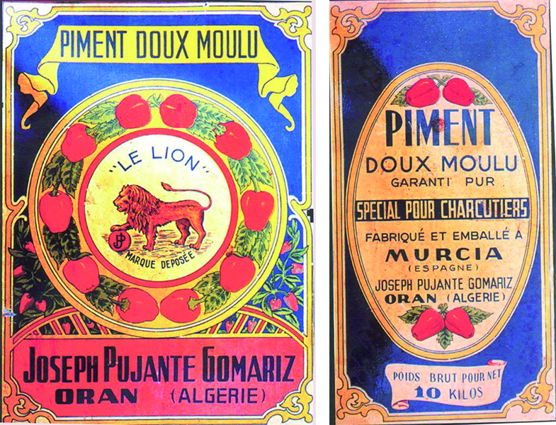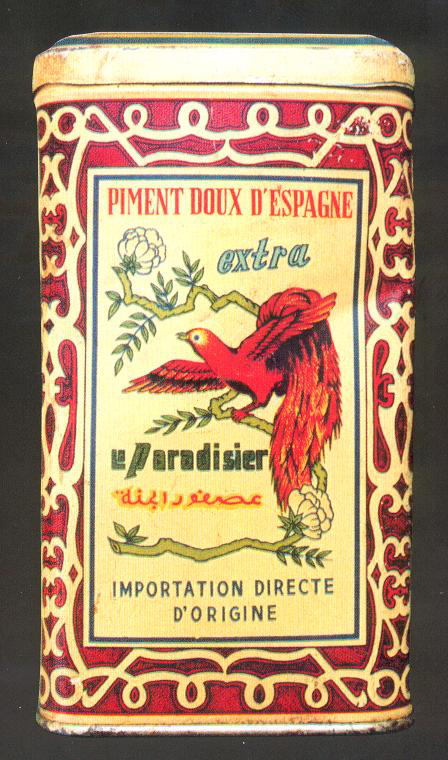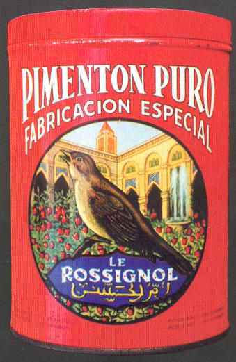 En estas latas enviadas a países extranjeros, como Argelia, se usaban tipografías  en el idioma del país de destino, como era el caso del francés o el árabe, ambos presentes en las latas vistas anteriormente. También es muy importante hacer referencia a la temática vegetal que se refleja en ellos, siempre estilizada, a veces buscando el equilibrio geométrico, como podemos observar en la orla que enmarca la figura del león, con motivos generales tales como los propios ñoros (pimientos con que se fabrica el pimentón) y la planta de estos.