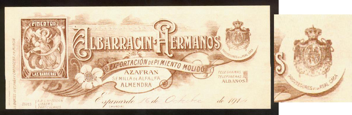Membrete de carta de la empresa en el que se justifica el honor de ser proveedores de la Casa Real, cuyo escudo aparece engalanado, entre guirnaldas. Detalle del escudo de la Casa Real.