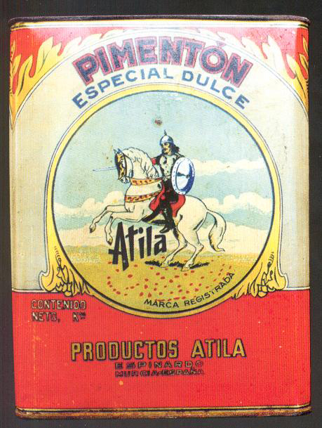 Otra marca de la empresa de Reverte, Atila, con claras alusiones históricas, volvería a relacionar el pimentón con la bravura, no ya del torero sino de un caudillo fuerte. En su diseño sigue presente el círculo a modo de orla en torno al personaje principal, "Atila a caballo". De este modo vemos repetirse aquí el gusto de la empresa Reverte por representaciones de animales, bien solos como el caso de "El Camello", o acompañados de personas, como en "La Lidia", "Atila". En cuanto a tipografía y colorido también se repiten tipografías sencillas y coloridos pobres. Otras marcas de la empresa eran Prestige (1950), Macarena (1951), El Picador, o Red Rose, esta última data de los años 70. Desgraciadamente de éstas nos ha sido imposible recopilar información gráfica debido a que no fueron tan importantes como las otras. También comercializaba con su nombre, es decir, Reverte, y con otra marca: El Pavo Real. Afortunadamente de estas sí que se conserva información gráfica. En su diseño aparece más variedad de tipografías, frente a los anteriores diseños de Reverte. Se ha optado en este caso por un dibujo esquemático y estilizado,  sobre un fondo plano sin decorado. Se mantiene la orla y en ella aparecen ahora plumas de pavo real, enriqueciéndola de este modo con respecto a los anteriores diseños de envases de Reverte.