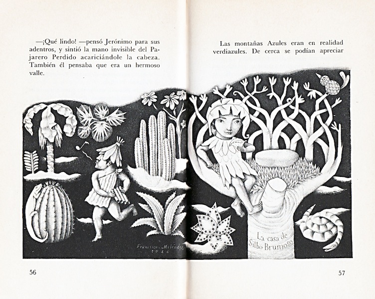 Ilustración de Francisco Meléndez para El valle de los Cocuyos, Gloria Cecilia Díaz, Editorial SM, 1986, p. 56-57. |