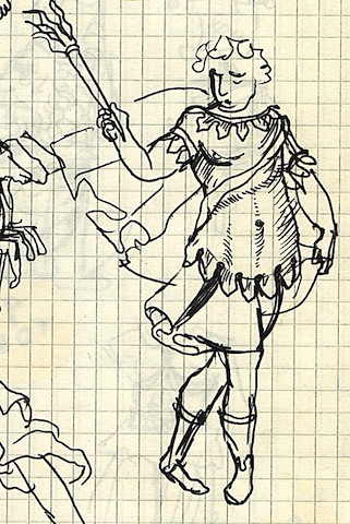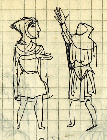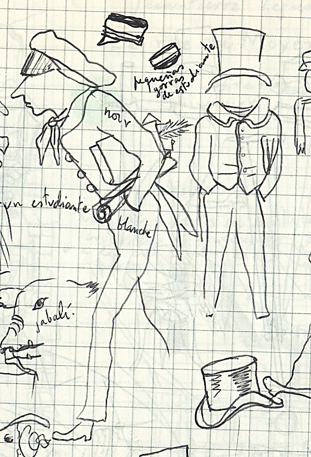 Dibujo en el cuaderno 2 de Francisco Meléndez, sobre imágenes del libro de Racinet, donde analiza la indumentaria, los gestos y las actitudes que representan una época. |