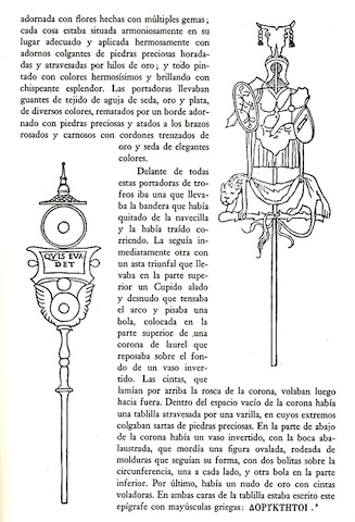 V. Numerosas alusiones a Hypnerotomachia Poliphili. LUCHA DE AMOR EN SUEÑOS DE POLIFILO, DONDE ENSEÑA QUE TODO LO HUMANO NO ES SINO SUEÑO Y ADEMÁS RECUERDA HÁBILMENTE MUCHAS COSAS DIGNÍSIMAS, conocido también como SUEÑO DE POLIFILO[9] de Francesco Colonna, obra impresa en 1499[10] por Aldo Manuzio.