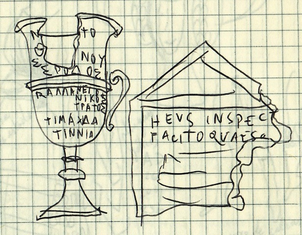 Dibujos pertenecientes al cuaderno 1 de Francisco Meléndez sobre la imagen perteneciente a Hypnerotomachia Polifhili |