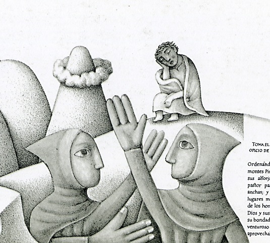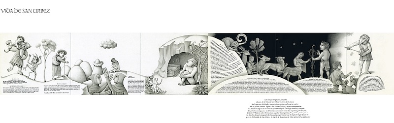 Imagen corrida de la Vida de San Úrbez, Diputación General de Huesca, 1986. Francisco Meléndez realizó las ilustraciones, decidiendo además la relación de estas con el texto y la tipografía. |