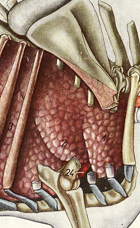 Detalle de la imagen « Vista de los órganos internos de una vaca », perteneciente al Atlas de anatomía topográfica de los animales domésticos.VOLUMEN II de Peter Popesko, Salvat D. L, 1981, p.15. |