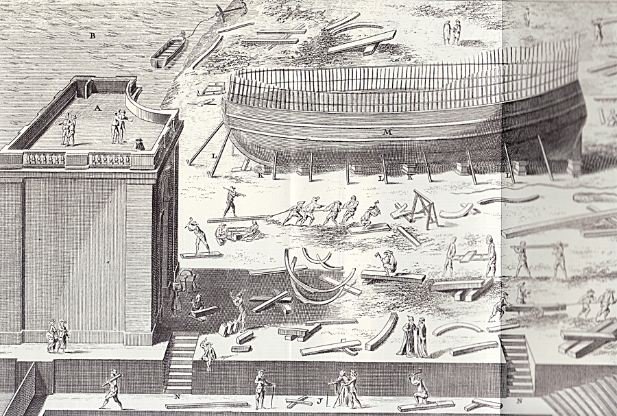 Detalle de la imagen «Marine. Chantier de Construction. Pl. viii» perteneciente a L’Encyclopédie: Recueil de Planches, sur les Sciences , les Arts Libéraux, et les Arts Méchaniques, avec leur explication, de Diderot y D´Alembert, Henri Veyrier, 1965. |