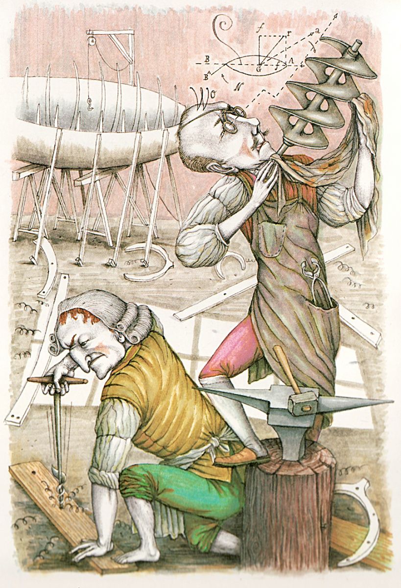 i. Elenco de panoplias, carruajes, instrumental técnico propio de variedad de oficios, arquitectura, peinados, mobiliario, instrumentos musicales, indumentaria de la época, mecanismos, animales y plantas marinos, heráldica, caligrafía, geometría plana, física, …