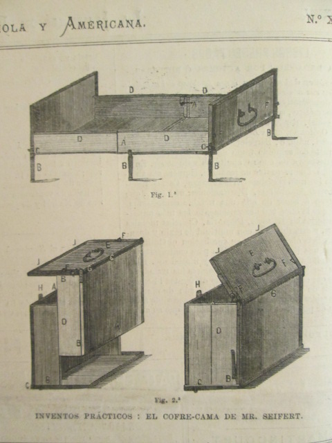 Imagen «Inventos Prácticos: El cofre-cama de Mr. Seifert», perteneciente a la revista La Ilustración Española y Americana (Núm.XXXII, 30 de agosto de 1879, p.118). Presenta un novedoso invento a modo de cama desplegable para viajes. |