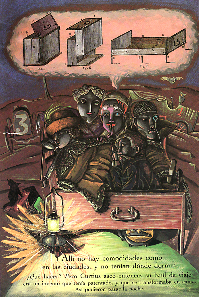 iii. Modos de contar: en la obra se hace uso de esquemas en «abismo», sueños dentro de sueños, relatos dentro de relatos. El uso de jeroglíficos y la introducción de secuencias narrativas dentro de las propias ilustraciones acompañan y refuerzan la idea de sueño, estableciendo una simbiosis entre palabra e ilustración, donde las dos se complementan para producir una unidad de mensaje.
