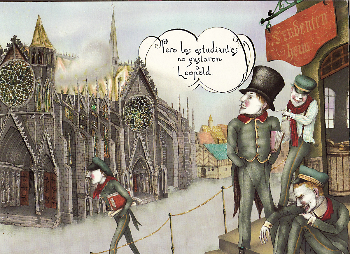 Ilustración de Francisco Meléndez perteneciente a su álbum ilustrado Leopold.La conquista del aire, Aura Comunicación, 1991.p.10. |