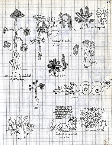 Dibujos en el cuaderno 1 de Francisco Meléndez sobre imágenes de relieves asirios, paleocristianos y románicos. |