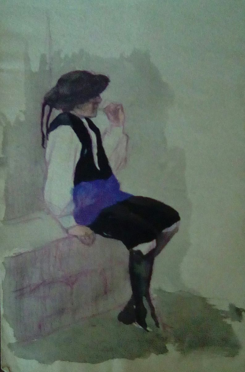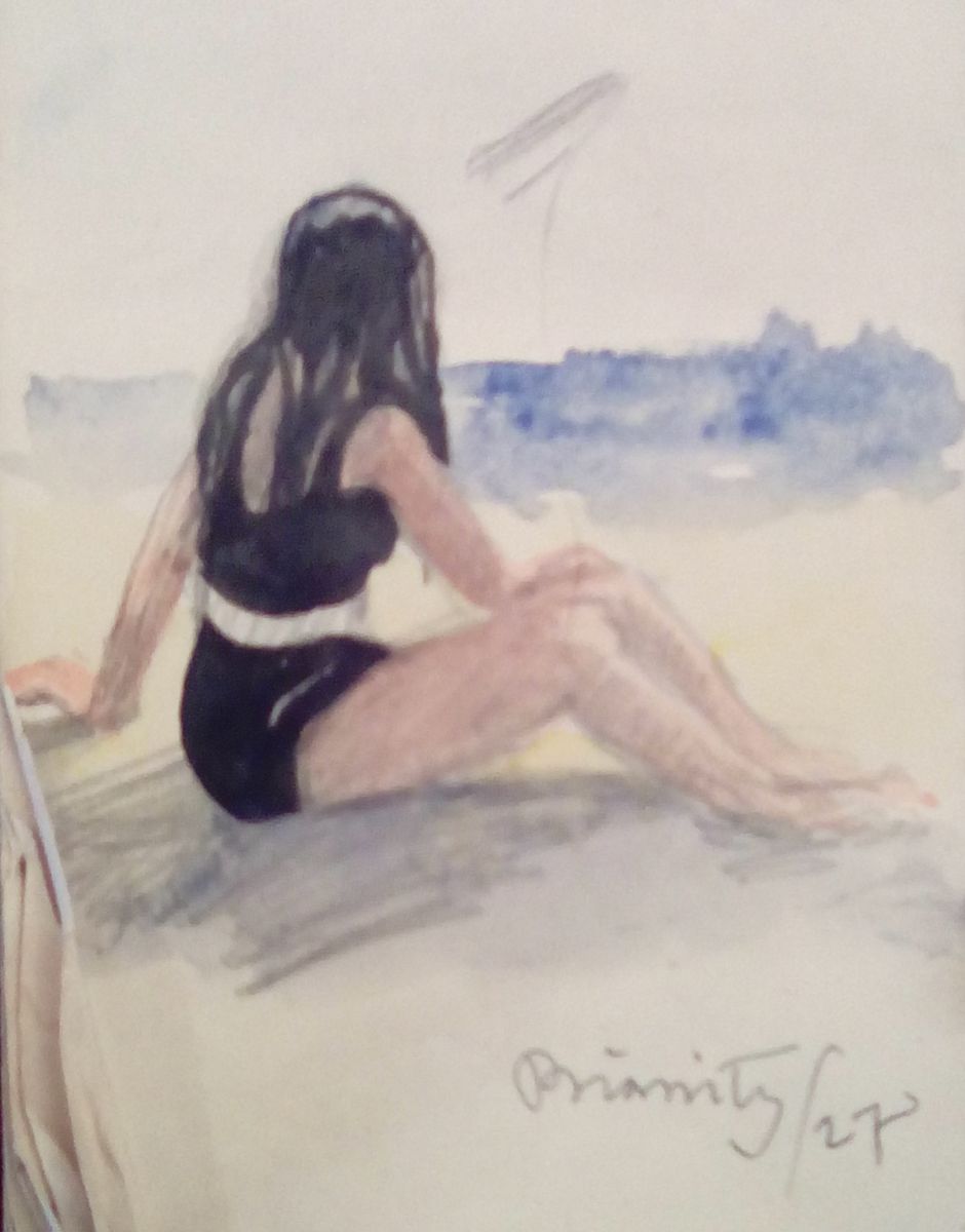 A menudo, los rostros se omiten como si se desarticularan al contacto con la luz y las iridiscencias que emite la arena rociada por la hiriente claridad con que el sol se presenta en el papel. Una joven sentada frente al mar pierde sus pensamientos entre las olas que se levantan con soplos de acuarela. El blanco del cielo pone lindes al azul y traza un horizonte que vaivenea salpicando el aire. El cuerpo girado de la joven proyecta una sombra gris, y en el negro de su traje de baño se funden las puntas de su cabello, que también visea con la claridad que baña la arena.