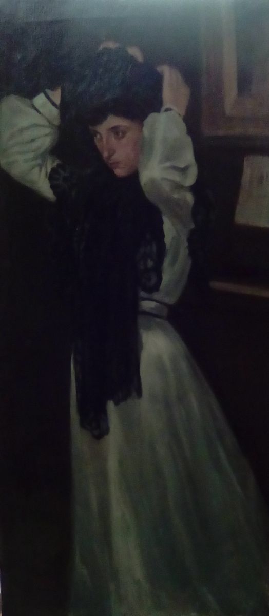 Buen ejemplo de ello es la obra que se muestra aquí y que conserva Pilar Olivares Cidón (nieta de Cidón), junto a los dibujos y cuadernos que se han tratado. Se trata de un lienzo vertical en el que aparece una joven de medio perfil cuya identidad podría ser la esposa del artista, según afirman los descendientes; aunque esa identificación no ha sido corroborada. El tratamiento del tejido evoca un roce sedoso al tacto a través de los brillos y sombras luciendo y desluciendo los blancos en coloraciones grises que se pliegan con realismo y elegancia.