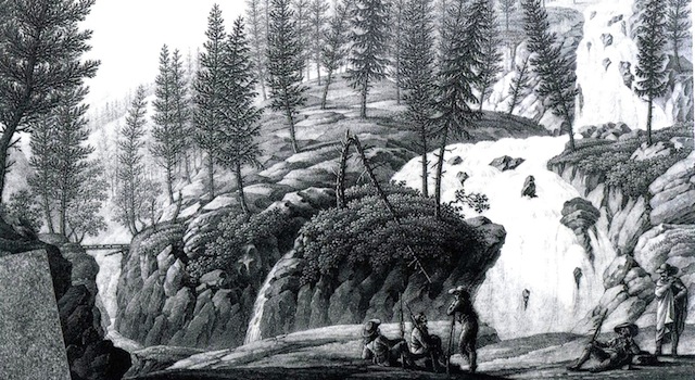 Antoine-Ignace MELLING (Karlsruge (Alemania), 1763-¿1831) Cascade du Gave du Val de Gaube Voyage pittoresque dans les Pyrénées françaises et dans les departments adjacents, Treuttel et Wurtz, Paris, 1826-1830. Plancha número 23. |
