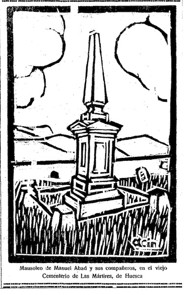 Lo llamaría monumento a Los Mártires de la Libertad, porque así habían pasado a la memoria colectiva de muchos y porque le evocaba este otro monolito casi escondido que se alza en el antiguo cementerio del cerro de Las Mártires (al noroeste de Huesca), erigido en 1855 en memoria de Manuel Abad y sus catorce compañeros republicanos, sublevados en 1848 que fueron pasados por las armas (Goya Hernández, 1930: portada; Bueno Petisme, 2007: 730). (Fig. 1).