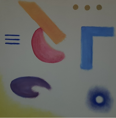Queda, para finalizar, Alcance directo, de 2019. Estamos ante el cuadro más rigurosamente abstracto, que sin duda marca un nuevo territorio eco del pasado, en plena juventud en torno al año 1971 si el artista mantiene una obra esporádica lejos de su personal y excelente línea neosurrealista pero, desde luego, sin abandonarla. Estamos ante un fondo blancuzco y en el lado inferior izquierdo amarillo. Tenemos, por tanto, un círculo blanco que desprende energía de color azul, tres círculos amarillos en la zona superior, un ángulo recto azul, un rectángulo, lo más parecido a una media luna, tres rectángulos paralelos en color azul y una forma eco de la paleta de un pintor.