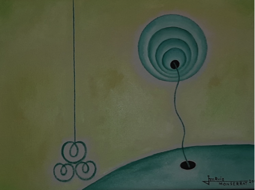 Mucho tiempo ha transcurrido desde que Aladrada Ediciones, de Zaragoza, nos publicaba, en 2015, el libro José Manuel Ruiz Monserrat. Realidad soñada, que abarca pintura, escultura, poesía y relatos. Con antelación a su personal línea artística, casi al mismo tiempo que pinta cuadros con el Nirvana como fuente de inspiración, concluye esculturas figurativas y diez abstractas de las que solo conserva una, que titulará Abstracción, de 1971, hecha con barro sin cocer patinado en blanco. Por entonces comentamos sobre el muy buen juego del volumen, como siempre, al servicio de un suave expresionismo con énfasis de las curvas y delicado movimiento por los finos entrantes y salientes para ofrecer la correspondiente variedad formal. También pinta cuadros abstractos, en 1970 y 1971, mediante sobrios colores y énfasis geométrico en la obra Más cerca del infinito, de 1970, aunque lo dominante son planos abstractos que acogen formas invadiendo el entorno por su poderosa vitalidad. Tenemos, por tanto, el ámbito vacío ocupado por anómalas formas. Basta ver el óleo sobre táblex Obsesión paralizante, de 1970.
