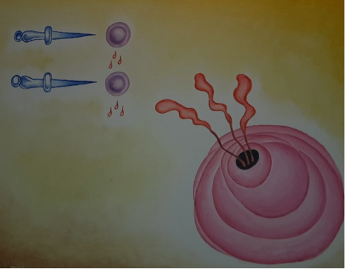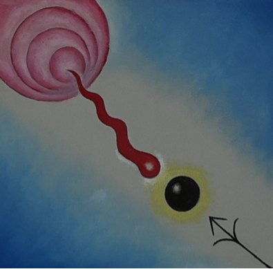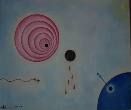 Descomposición con alcances, de 2018, tiene la sugerencia del típico cielo, en azules y blancos, sobre el que se recortan y flotan los círculos concéntricos en color rosa, una esfera negra flotante, lo más parecido a un espermatozoide pero aquí con punta de flecha y otra esfera azul de la que emerge una forma invasora muy compleja de definir en el sentido de su función.