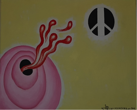 Se describen los cuadros: Explosión cósmica ante la paz, de 2016, se basa en un fondo azul y plano irregular blanco en el centro, cual evocación del cielo, al que incorpora círculos concéntricos del que nace una forma ondulante, rematada en el centro por una esfera negra, muy típica en sus cuadros neosurrealistas. En el lado derecho figura una especie de flecha como si fuera una amenaza lanzada hacia la esfera negra. Único rasgo figurativo.